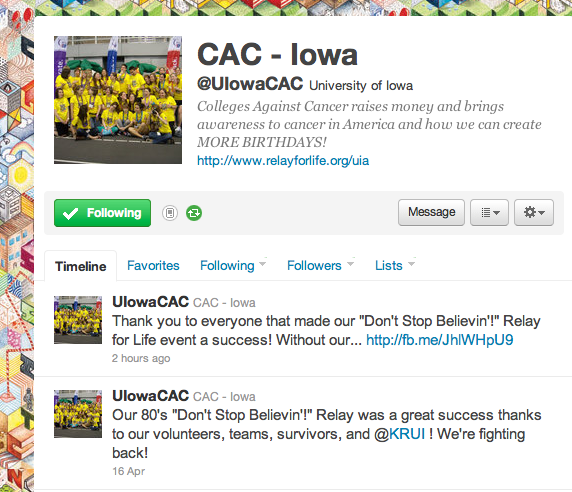 Now, this year CAC also introduced the idea of having a Twitter account, which I was also in charge of. The nice thing about the Twitter account is that it directly connects to Facebook so if I wanted to update the “status” of the CAC/UI Relay for Life group page, it would automatically update the CAC Twitter account’s page as well!